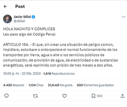 “Hola Nachito y cómplices. Les paso algo del Código Penal” comenzaba su mensaje en X (exTwitter) el mandatario.