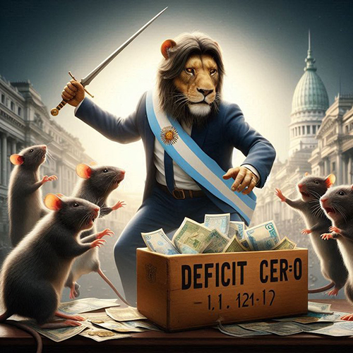 Según su posteo en su cuenta de X, se autopercibe como un león que enfrenta con su espada a “ratas”, los diputados, que tratan de acercarse a una caja con dólares.
