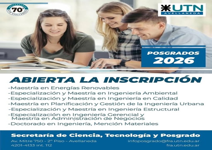 Se dictan carreras de Doctorado, Maestrías y Especializaciones. Desde la Secretaría de Ciencia, Tecnología y Posgrado, la UTN Avellaneda abre la inscripción al ciclo 2026 de las carreras de posgrado dirigidas a graduados, graduadas, docentes, investigadores y profesionales del ámbito público y privado.