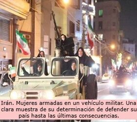 Un valiente grupo de mujeres armadas conducen un vehículo militar en una clara muestra de su férrea determinación a defender su país hasta las ultimas consecuencias.